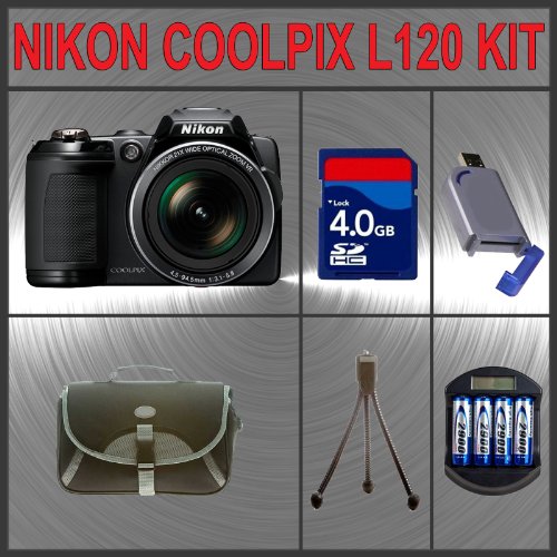 Nikon Coolpix L120 Digital Camera (Black) + Huge Accessories Package Including 4GB SDHC Memory Card + 4 AA Battery Pack with Extended Life Charger + Hi-Speed SD Card Reader + Carrying Case + Table Top Tripod Kit Feature